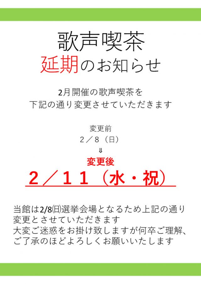 2/8(日)に予定しておりました「歌声喫茶inトモア」ですが